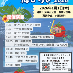 毎年恒例の「日本一早い!海びらき2025」開催決定!!元旦は皆様お誘いあわせの上、是非ご参加ください。 2024年、1年を振り返るスライドショーは12月31日午後6時からYouTubeで配信します。小笠原村観光協会のYouTubeチャンネルで観てください♪♪